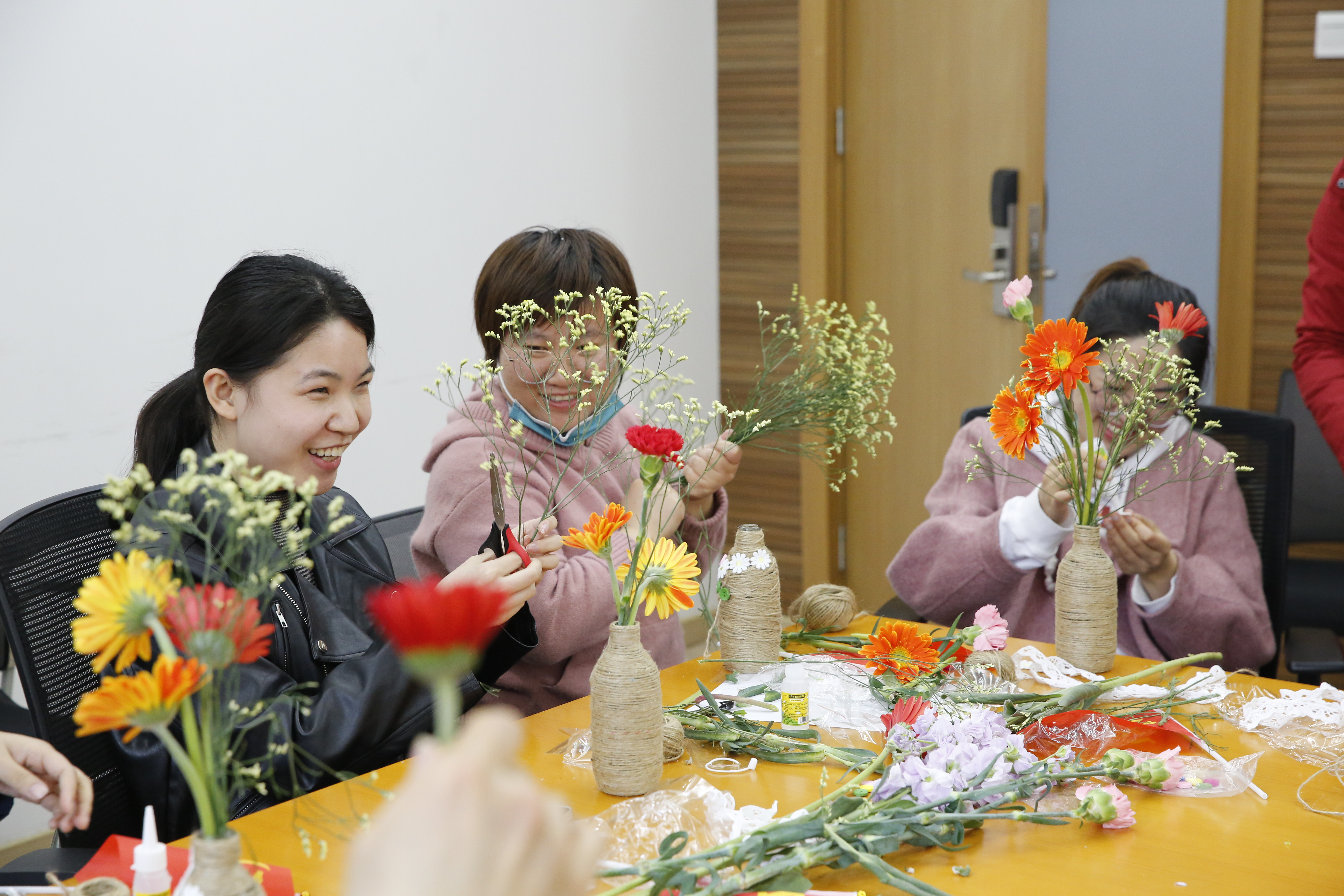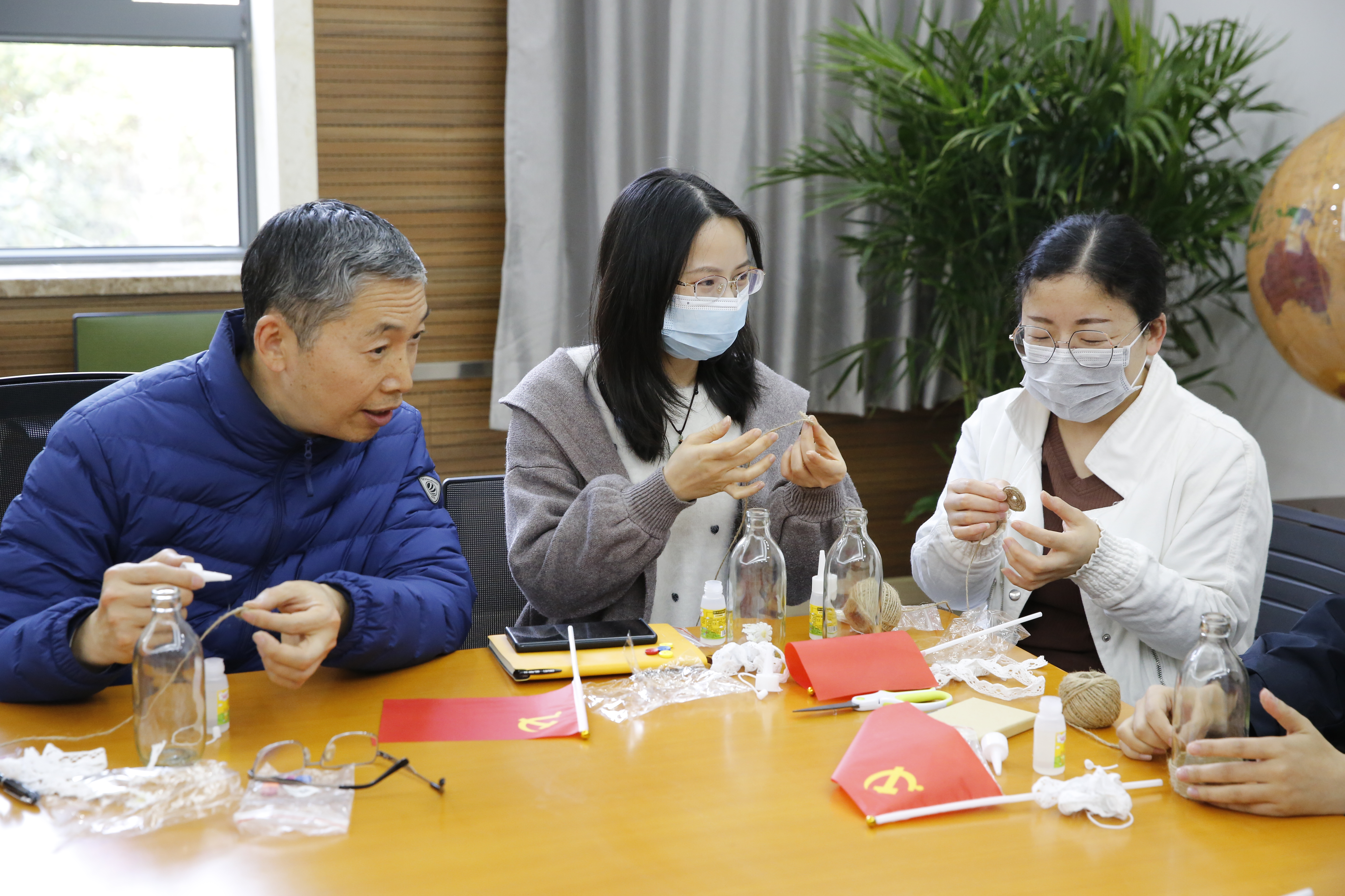 然后开始了装饰花瓶和插花的活动,利用废弃饮料瓶和简单的麻绳,每个人装饰出了各自心目中最美的花瓶。鲜艳的党旗和各色的鲜花在手工花瓶的映衬下分外美丽,一如大家的笑脸。