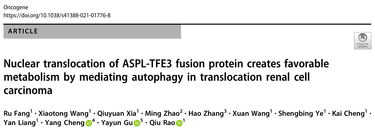 该研究成果近日在医学一区期刊Oncogene(实时IF:9.308)在线发表,文章题目为“Nuclear translocation of ASPL-TFE3 fusion protein creates favorable metabolism by mediating autophagy in translocation renal cell carcinoma”。该论文联合转录组学、表观组学及代谢组学,阐述了ASPL-TFE3易位性肾癌恶性增殖的相关调控回路,打破了易位性肾癌关注单通路调控的固定思维,首次提出ASPL-TFE3融合基因转录调控自噬并反向激活mTOR信号通路,为ASPL-TFE3易位性肾癌的治疗提供了新的思路。在本项目的进程中,研究团队克服了很多困难,饶秋教授提供了研究的设计思路,大力推进实验进展,为论文的通讯作者。同时特别感谢国家自然科学基金的资助。