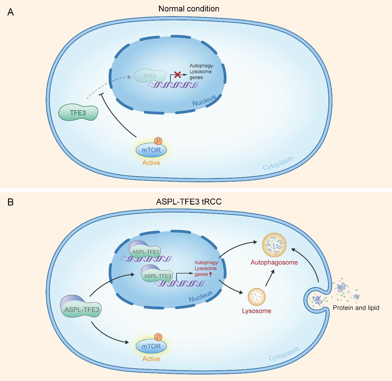 目前,关于ASPL-TFE3易位性肾癌的基础性研究甚少,ASPL-TFE3融合蛋白的具体功能和作用机制亦尚不清楚。鉴于此,饶秋教授团队通过ChIP-seq与RNA-seq共分析,深入研究了ASPL-TFE3融合基因的转录调控回路,首次发现ASPL-TFE3融合蛋白可直接结合自噬相关基因的启动子区域,强力激活自噬通路。明确了自噬通路在ASPL-TFE3易位性肾癌中的重要作用。考虑到自噬与营养物质代谢之间的联系,研究团队进一步进行了非靶向代谢组学检测。发现ASPL-TFE3融合基因通过激活自噬通路,促进脂质及氨基酸等营养物质的利用,缓解肿瘤细胞的能量应激状态,从而促进肾癌细胞的增殖。最后研究团队发现:在生理情况下,TFE3蛋白受mTOR通路调控入核,而在ASPL-TFE3易位性肾癌的情况下,ASPL-TFE3融合基因反向强力激活mTOR通路,mTOR与自噬通路的异常激活共同促进了肿瘤细胞的增殖(如图)。