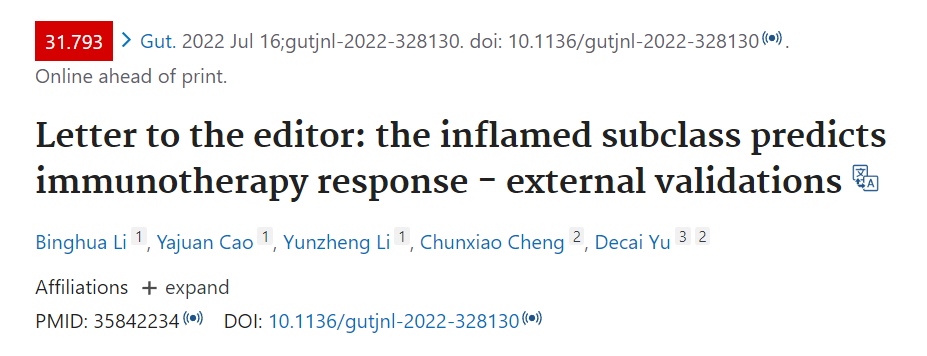 近日,BETWAY必威附属鼓楼医院余德才教授团队通过转录组测序(n=41),在亚洲肝癌人群中验证了Inflamed class可以预测肝癌患者PD1抑制剂治疗的疗效,并进一步证实该结论可以推广到泛肿瘤。该研究结果以研究性letter的形式发表于同刊,BETWAY必威附属鼓楼医院博士后黎兵华为第一作者,余德才教授为通讯作者。该工作得到了国家自然科学基金青年和面上项目的资助。
