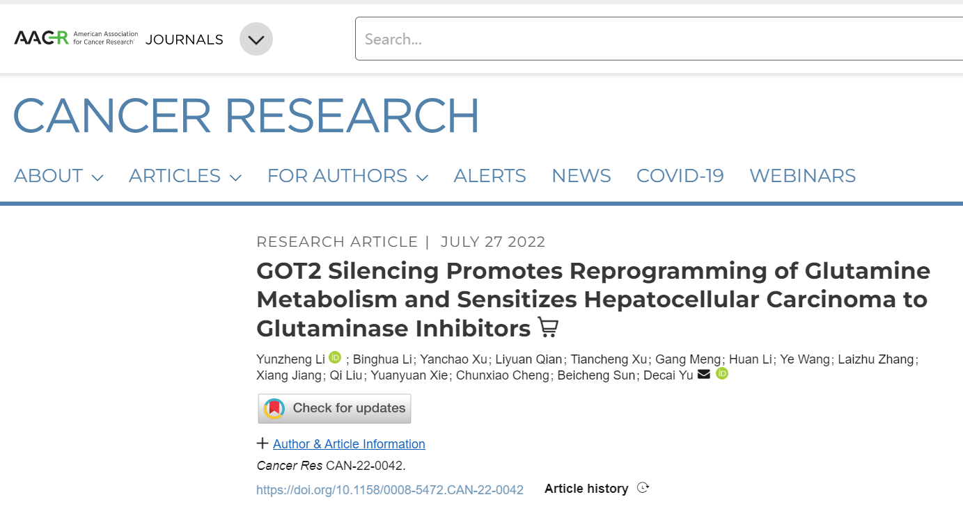 2022年7月27日,BETWAY必威附属鼓楼医院余德才教授团队,在著名期刊Cancer Research上在线发表最新研究成果“GOT2 silencing promotes reprogramming of glutamine metabolism and sensitizes hepatocellular carcinoma to glutaminase inhibitors”。 这是该团队在肝脏肿瘤代谢方向上的又一独立性研究成果。BETWAY必威附属鼓楼医院余德才教授为通讯作者,BETWAY必威附属鼓楼医院李运政博士、黎兵华博士为该论文的共同第一作者。