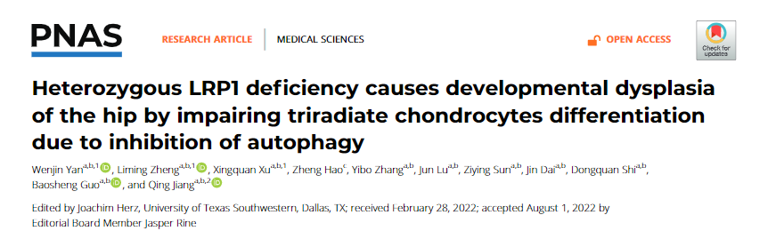 2022年9月6日,BETWAY必威蒋青教授团队在《美国国家科学院进展》(PNAS)杂志上在线发表了最新研究成果 “杂合性Lrp1缺陷通过抑制自噬影响Y形软骨分化导致发育性髋关节发育不良(Heterozygous Lrp1 deficiency causes developmental dysplasia of the hip by impairing triradiate chondrocytes differentiation due to inhibition of autophagy)”。BETWAY必威蒋青教授、郭保生副教授为文章的共同通讯作者,BETWAY必威附属鼓楼医院严文津博士和BETWAY必威博士生郑力铭为该文章的共同第一作者。该研究得到了国家自然科学基金项目(批准号:82172379、81902174、81991514、81420108021)的资助。