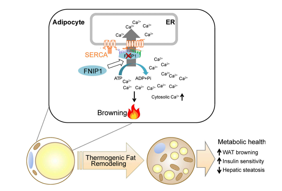 In this paper, the researchers discovered a crucial function of FNIP1 in controlling WAT browning that governs systemic glucose homeostasis (Figure 1). Using adipocyte-specific knockout mice and primary adipocytes in culture, we provided strong data that demonstrate FNIP1 as a negative regulator of beige adipocyte thermogenesis. We also uncovered a novel molecular mechanism whereby FNIP1 directly binds to and promotes the activity of SERCA, the main Ca2+ pump responsible for cytosolic Ca2+ removal, thereby dampening the Ca2+-dependent thermogenic program. Furthermore, the paper showed that the FNIP1 pathway exerts profound effects on systemic glucose homeostasis and hepatic steatosis. Thus, we discovered a novel FNIP1-SERCA-intracellular Ca2+ pathway that regulates WAT browning.