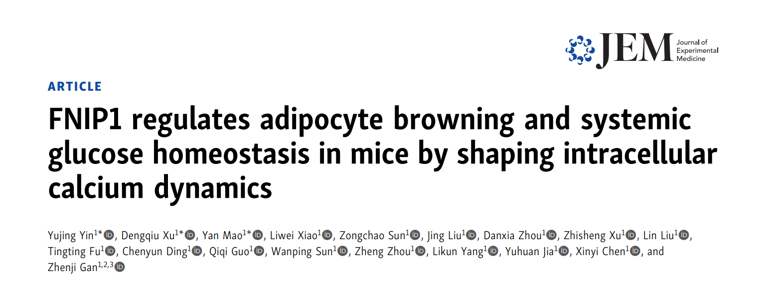 On April 12, 2022, Professor Zhenji Gan’s group at the Model Animal Research Center of Nanjing University published a research paper titled “FNIP1 regulates white adipose tissue browning and systemic glucose homeostasis by shaping intracellular calcium dynamics” in the Journal of Experimental Medicine. This paper revealed a novel mechanism by which the FNIP1 protein regulates thermogenic remodeling of white adipose tissue through the endoplasmic reticulum SERCA Ca2+ pump. The co-first authors of this paper are Yujing Yin, a doctoral student at Nanjing University, Dengqiu Xu, a postdoctoral fellow, and Yan Mao, a doctoral student, while Professor Zhenji Gan is the corresponding author. This work was highlighted by Prof. Lawrence Kaza.