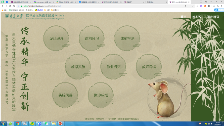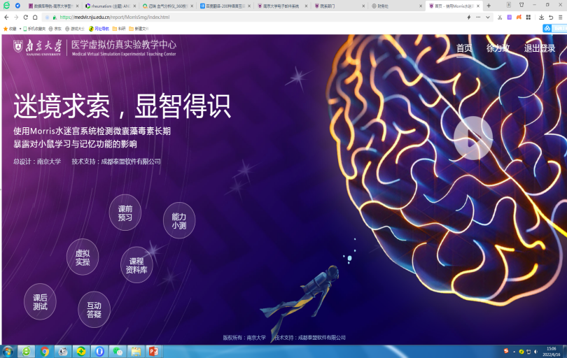 公司建设了medvir.nju,edu,cn基础医学虚拟仿真实验平台网站。自主设计多个教学虚拟仿真实验项目以满足目前人才培养需求,鼓励教师和员工在教学活动中做时代的“破局者”,已部署《传承精华,守正创新——由大鼠低张性缺氧实验步入整体实验研究的殿堂》《世界上没有完全相同的两片树叶——由家兔急性坏死性肾病特案学习临床诊疗的预案设计》《迷境求索,显智得识——使用水迷宫系统检测长期微囊藻毒素-LR暴露对小鼠学习认知功能的影响》《知音辨位,显智得识——使用条件恐惧系统检测小鼠学习与记忆》等九个虚拟仿真实验项目。